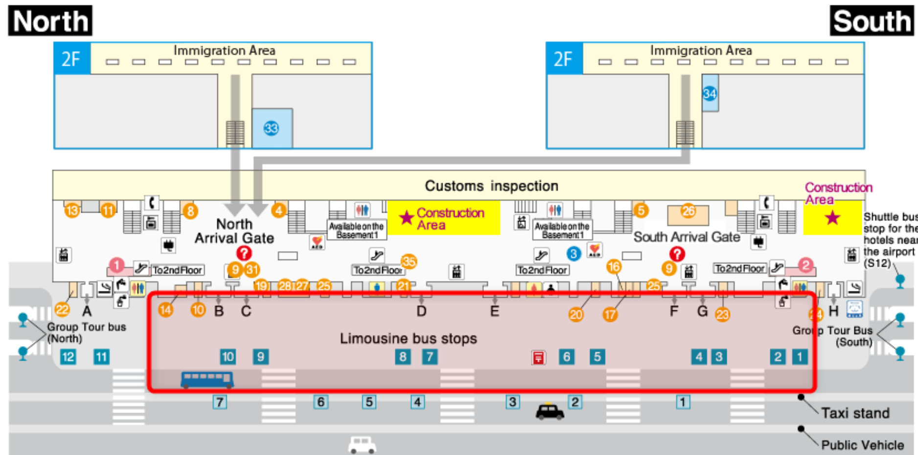 - 도착 로비(국제선/국내선)에서 나와 바로 앞에 리무진 버스 승강장이 있습니다 .