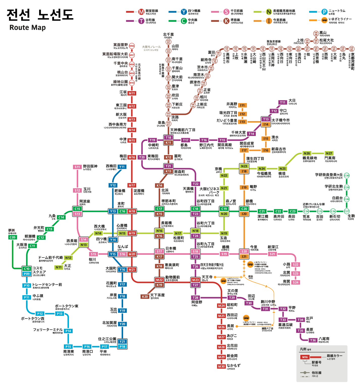 - 미도스지선 (빨간색, M) – 우메다ㆍ신오사카ㆍ난바ㆍ덴노지를 잇는 대표 노선